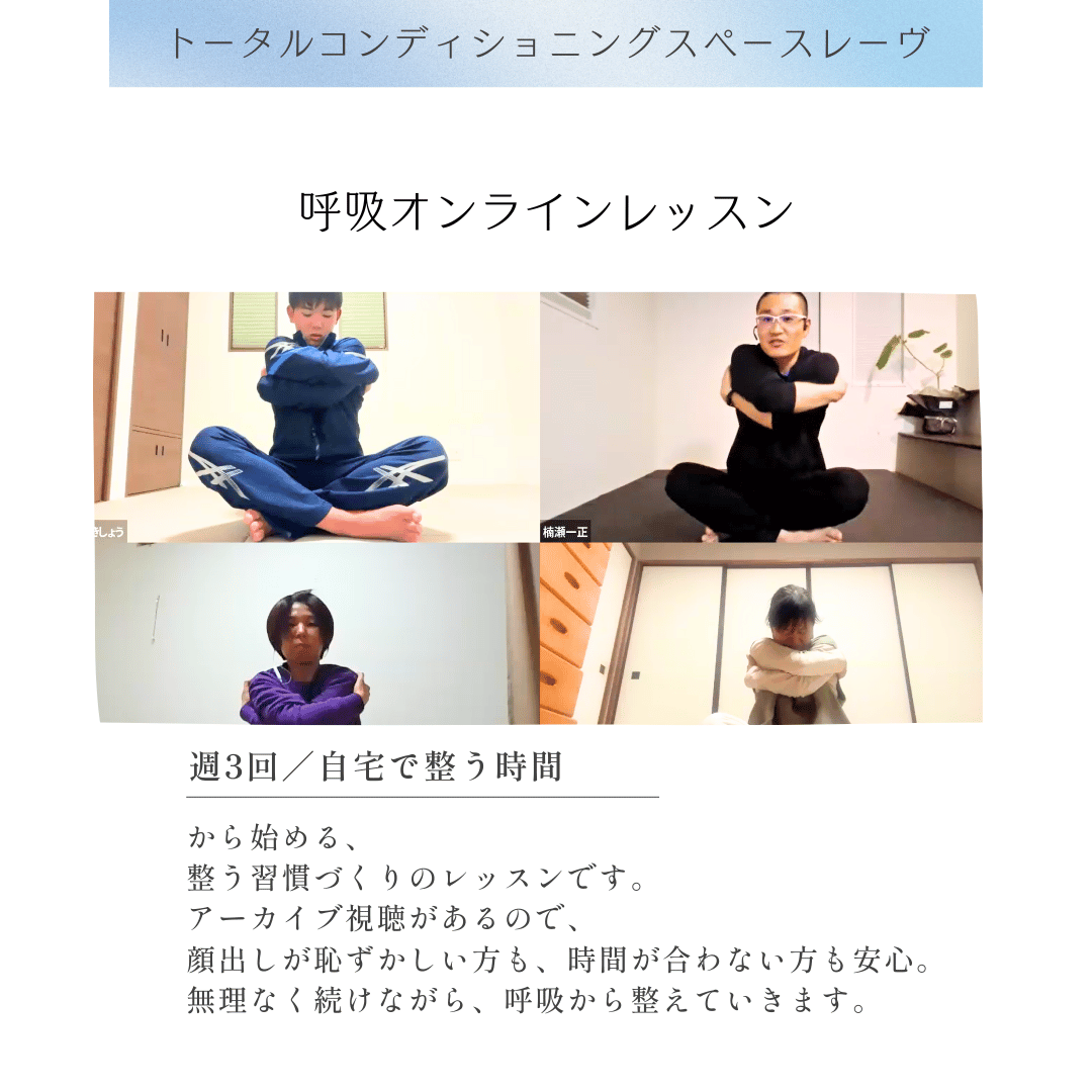 あわせて、呼吸オンラインレッスン(月12回開催)と週1回のセルフケア動画で、整えた状態を日常でも保てるようにします。